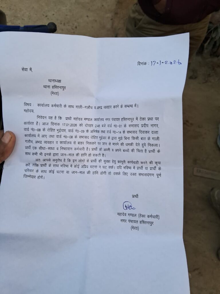 कुछ ही समय बाद अचानक कर्मचारी महादेव ने हस्तिनापुर थाने पहुंचकर सभासद रोहित भूहियार के खिलाफ लिखित तहरीर दे दी। तहरीर दिए जाने की खबर फैलते ही नगर पंचायत में हड़कंप मच गया। इसे लेकर तरह-तरह की चर्चाएं शुरू हो गईं—क्या मामला दबाया जा रहा था? या फिर किसी बड़े सियासी खेल की पटकथा पहले से लिखी जा चुकी थी?